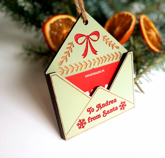 Custom wooden gift card or money holder, envelope ornament for Christmas gift personalized with name or message, sage green and red