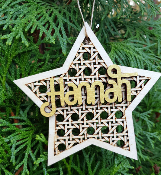 Personalized wooden bauble child name laser cut first Christmas ornament gift rattan style star