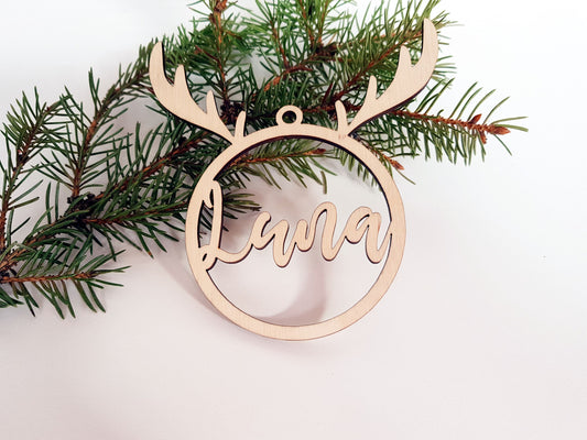 Personalized wooden ornament with any name laser cut reindeer first Christmas bauble gift natural wood